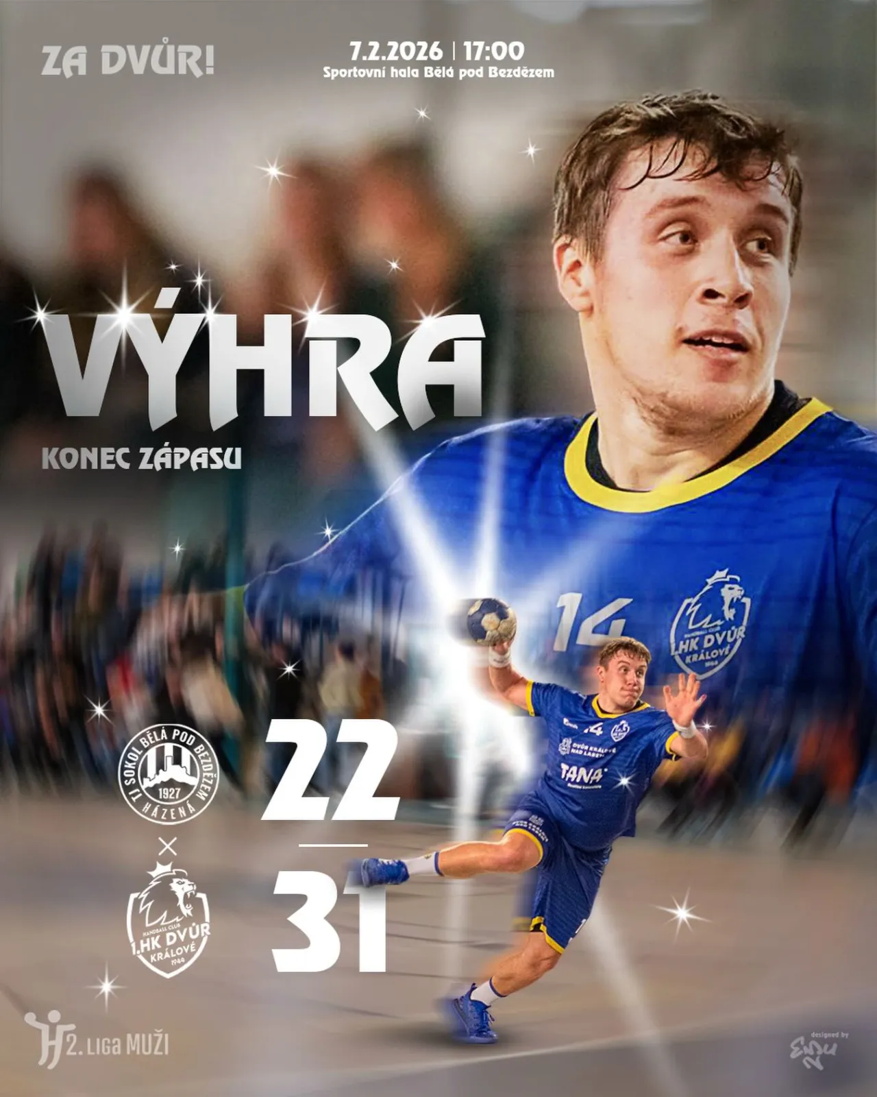 Dohrávku 4.kola v Bělé pod Bezdězem jsme i přes nevydařený první poločas zvládli a zlepšeným výkonem ve druhém poločase dokázali zvítězit o 9 branek 22:31 (13:12)!
